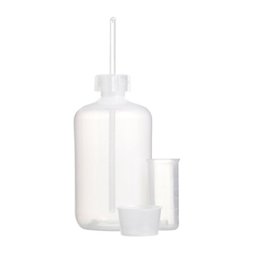 - Composed of a dispensing cup which slides onto a delivery tube which is set in a 500mL LDPE sample bottle.