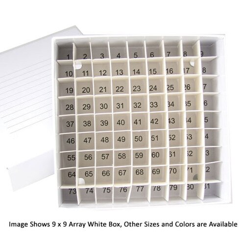 - Numbered grid on the inside bottom of each box aids in sample identification