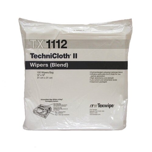 TexWipe® TechniCloth® II cleanroom wipes provide the lowest level of releasable ions and non-volatile contaminants, contain no chemical binders and tolerate most standard solvents. These cleanroom wipes are manufactured with a hydroentangled of 55% cellulose and 45% polyester which provides the optimum balance of sorption, durability, and cleanliness.